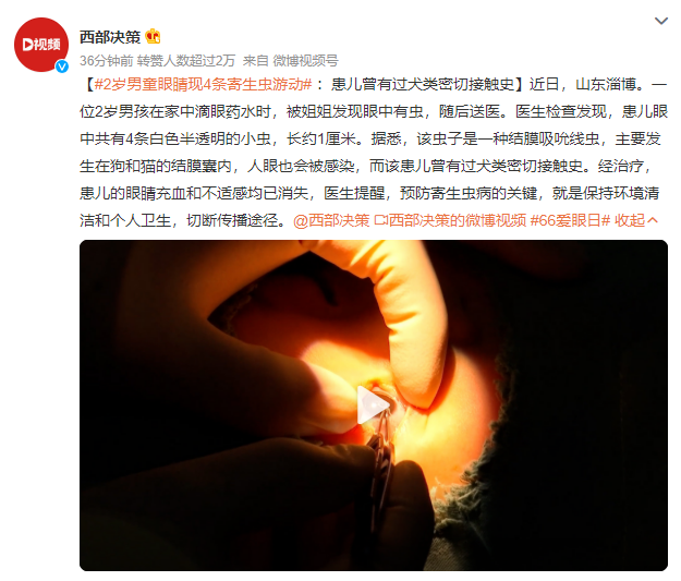 近日一则令东说念主揪心的新闻 冲上了热搜,#2岁男童眼睛现4条寄生虫游动#。